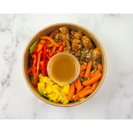 Składniki: Kurczak  21,4% (udka z kurczaka 97,2%, sos chili słodki (cukier, woda, chili 16 %, czosnek, sól, modyfikowana skrobia kukurydziana, regulator kwasowości: kwas octowy)         2%, olej rzepakowy 0,8%, papryka słodka 0%, pieprz czarny 0%, sól 0%), Sos         fistaszkowy 19,1% (oliwa z oliwek 61,8%, masło ORZECHOWE /ORZESZKI ARACHIDOWE/         33,3%, ocet ryżowy (woda, ryż) 4,8%, sól 0,1%), Mix sałat 18,2% (mix sałat (rukola, cykoria escarola, endywia frisee, radicchio) 100%), Papryka czerwona 16,7% (papryka         czerwona 100%), Marchew 13,7% (marchew 100%), Mango  10,6% (mango 100%), Słonecznik         prażony 0,3% (nasiona słonecznika 100%)